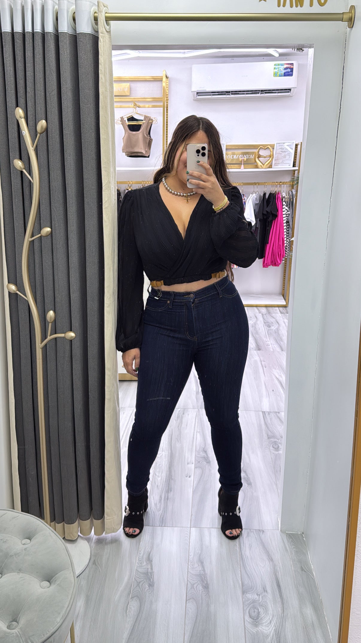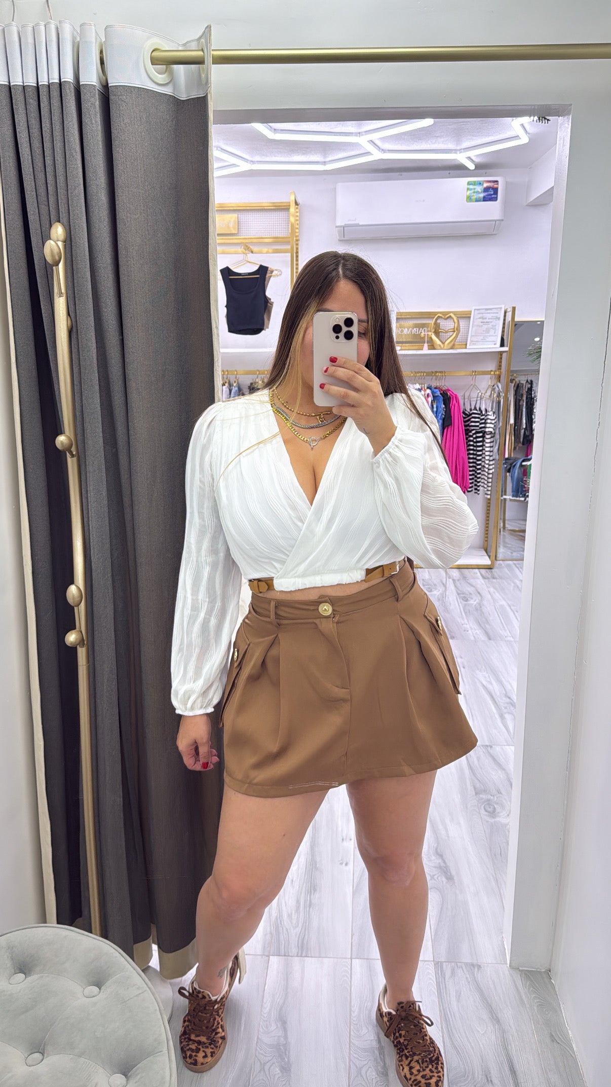 BELTED TRIM LONG SLEEVE BLOUSE TEXTURED