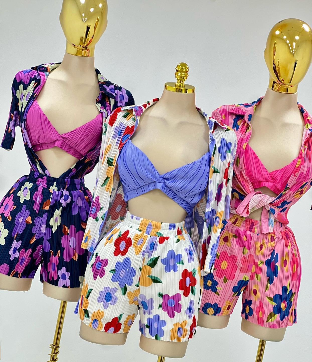 set de flores de tres pieza se ajutan las tiras del bra y el pantalon tiene elastico en la cintura