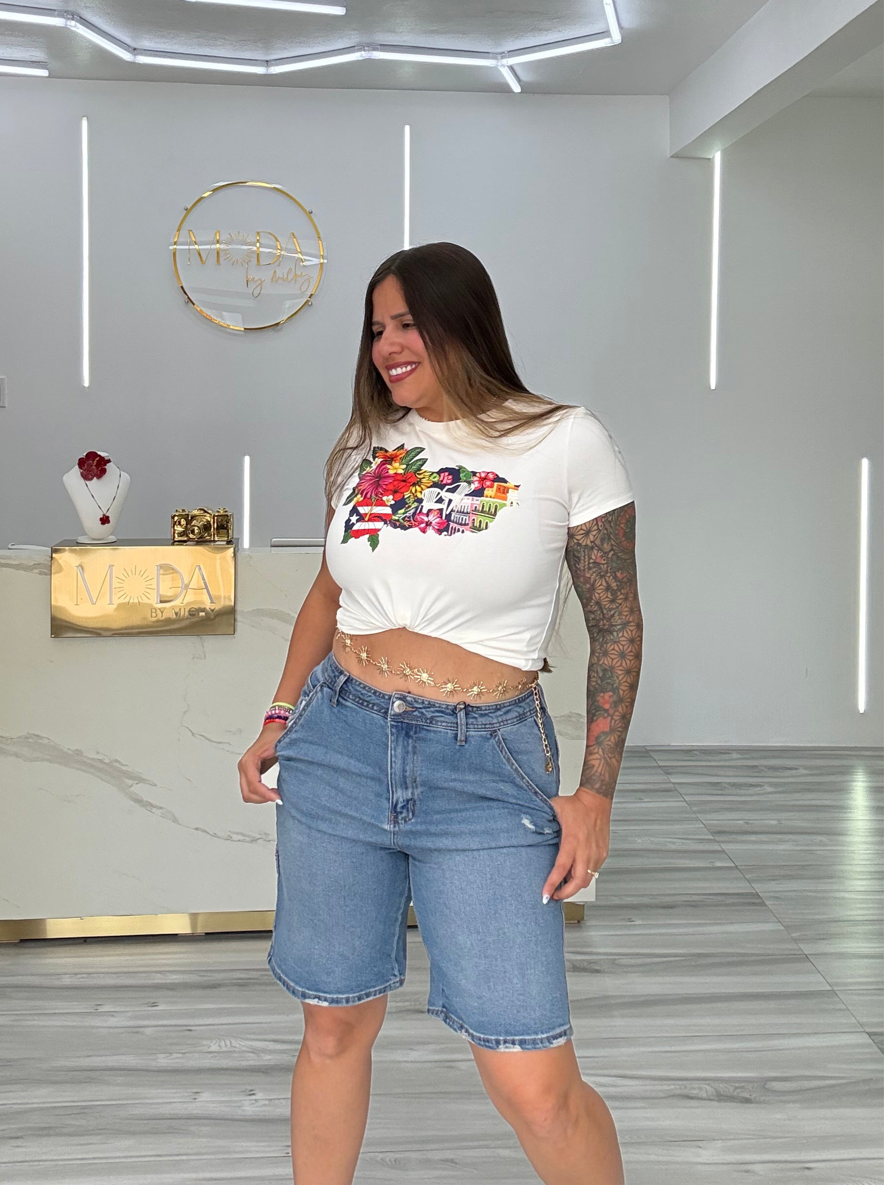 denim Bermuda shorts, designed in a light color wash for a fresh, casual look.