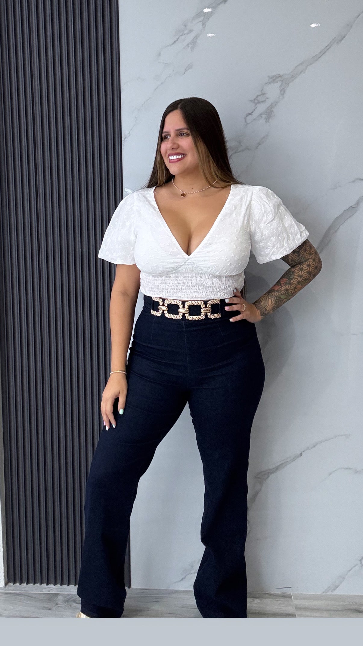 - HERRAJES DE HEBILLA EN LA CINTURA, CREMALLERA EN LA PARTE POSTERIOR