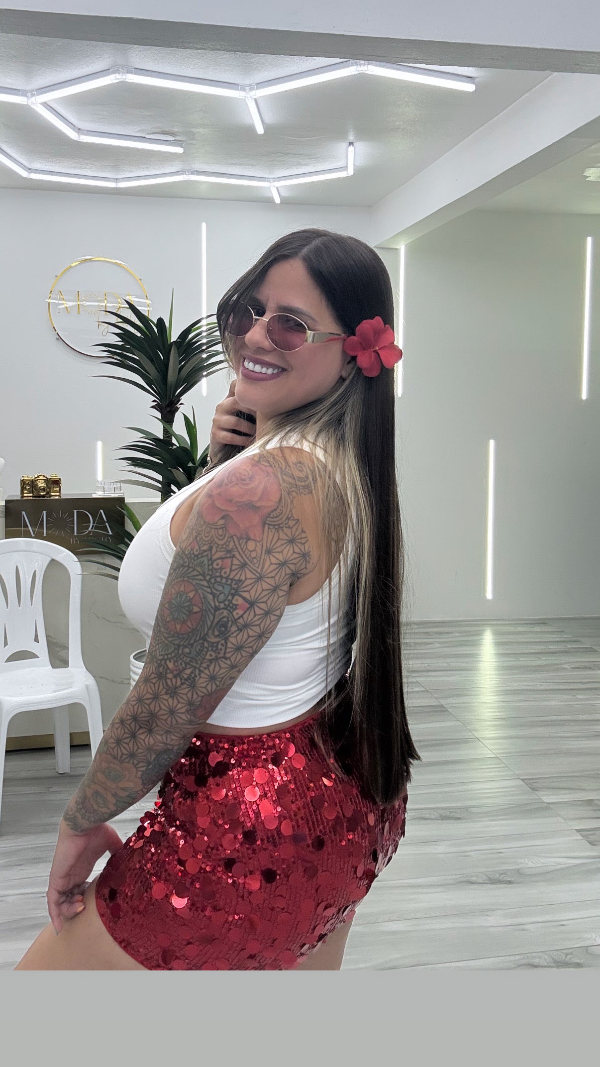 Minifalda con brillo en forma de A. Una minifalda brillante y llamativa adornada con lentejuelas, ideal para una salida nocturna o una ocasión festiva.